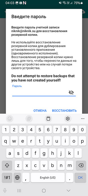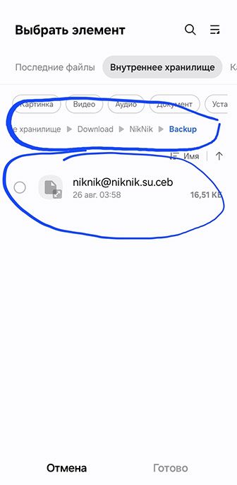 Находим резервную копию по пути «Внутреннее хранилище-Download-NikNik-Backup» и восстанавливаем её.